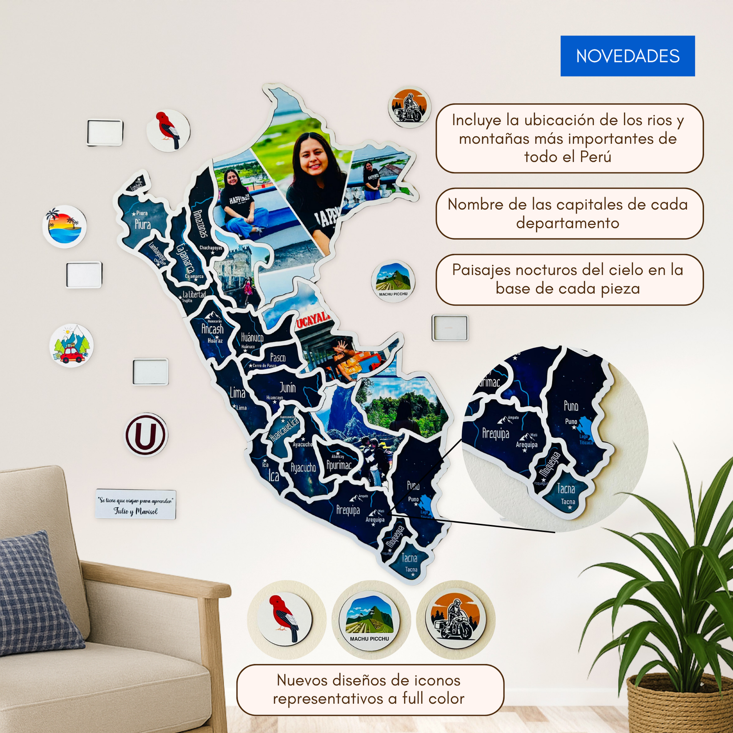 Si adquiere la opción de fotografías, sus fotos se le enviaran impresas sobre las piezas en su pedido.Para sus futuros viajes enviamos papel fotográfico adhesivo, las piezas de todos los destinos y la plantilla digital Canva con las siluetas donde podrá editar las fotos según cada lugar e ir completando el mapa.