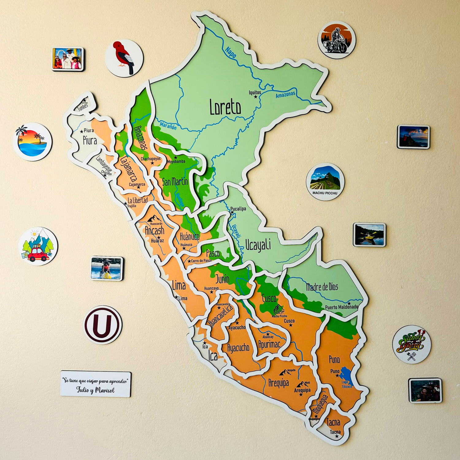 Personalizado con grabado láser de alta precisión, este mapa adopta un diseño minimalista y estético que realza con sutileza cada región del Perú.
