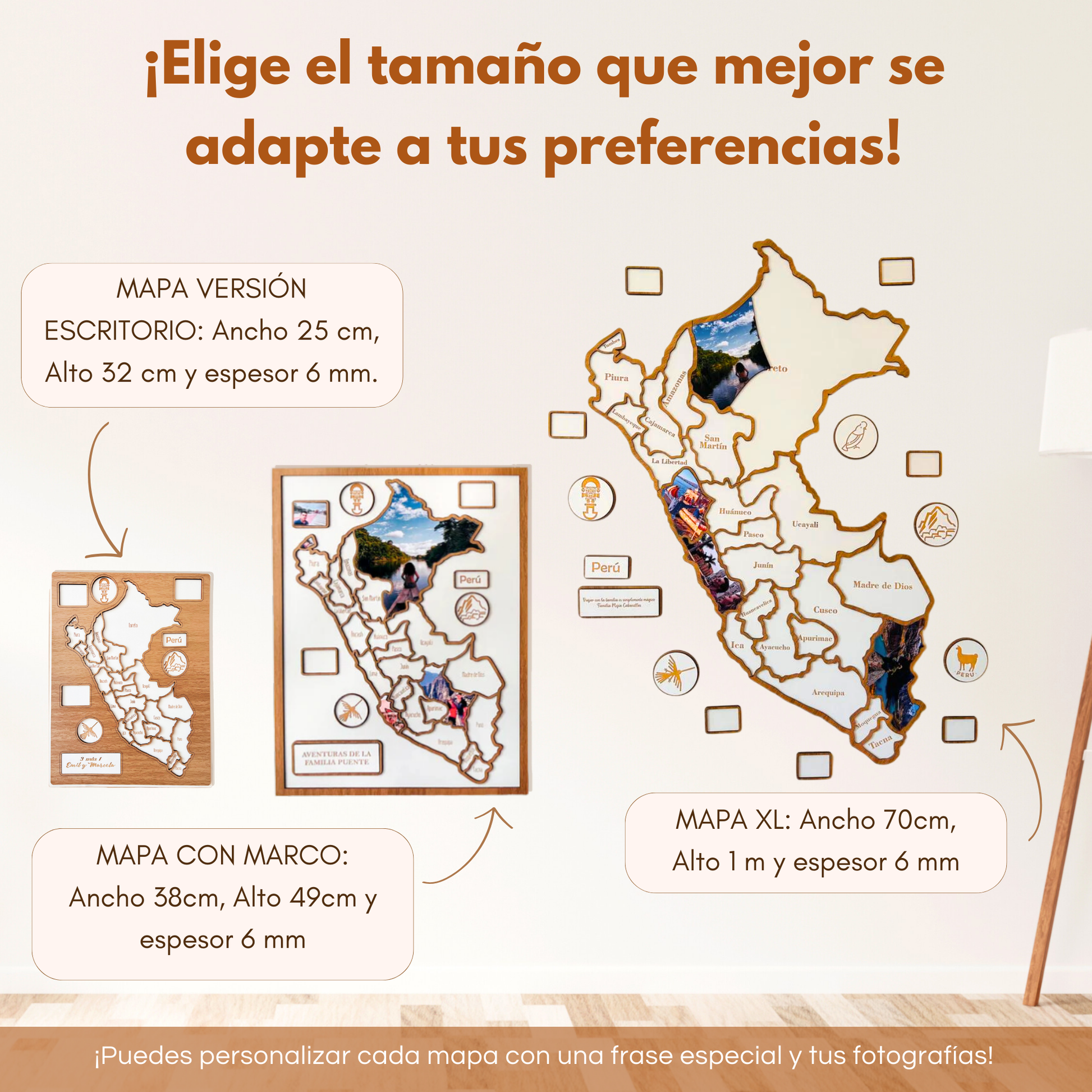 Si adquiere la opción de fotografías troqueladas, sus fotos se le enviaran impresas junto al pedido.Para sus futuros viajes enviamos papel fotográfico adhesivo, las piezas de todos los destinos y la plantilla digital Canva con las siluetas donde podrá editar las fotos según cada lugar e ir completando el mapa.